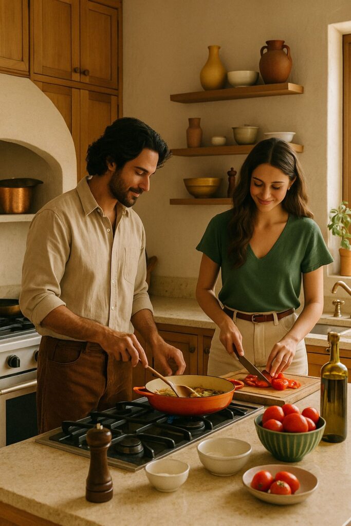 Auch das offene Präsentieren von Zutaten ist typisch: Olivenöl in Glasflaschen, getrocknete Kräuter, frischer Basilikum auf der Fensterbank. So wird die Küche zur kulinarischen Werkstatt – immer bereit, etwas Köstliches zu zaubern.