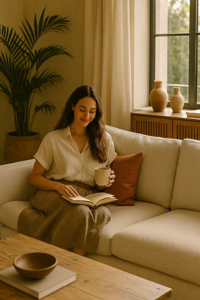Setze gezielt Farbakzente – zum Beispiel mit Olivgrün, Himmelblau oder Gelb – am besten in Form von Kissen, Vorhängen oder Keramiken. So wird aus einem Raum ein mediterraner Rückzugsort.